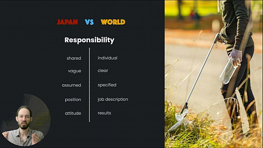 日本では,責任感は個人が持つものではなくチームで共有する。とにかくチームワークが重視され,同僚を批判することがない。責任はチーム全体が取り,誰が責任を取るべきかの境界線が曖昧だ。海外では地位がどうあれ,自分がやったことにのみ責任を取るが,日本では誰がやったにしろ,地位のある者が責任を取る。また,評価基準が独特で,海外では結果が評価されるのに対し,日本では正しい姿勢や懸命に働いたことが評価される。