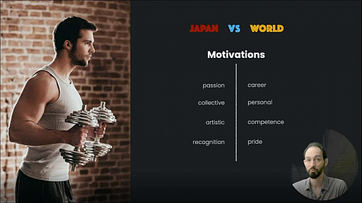 日本ではキャリアの向上よりも情熱の実現を目的とし,個人が成果を上げることではなく,チームへの貢献にモチベーションを感じている。自分のことを能力を持ったプロであるというよりアーティストであると見なす。また,個人のプライドよりもチームとしてどう評価されるかを重視する。