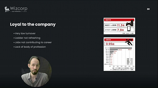 キャリアアップよりも会社への忠誠心が重視される。日本のゲーム業界は海外と比べると転職回数や離職率が低いため,キャリアを伸ばすチャンスが少なく,昇進の順番が回ってきづらい。上司に恵まれず数年を無駄にしたり,会社への忠誠心ゆえにキャリアにならない仕事をやったりすることがある。こうしたことから,皆と情報を共有し,技術を磨いてプロになるという意識が少なく,結果としてプロの層が薄くなっている。
