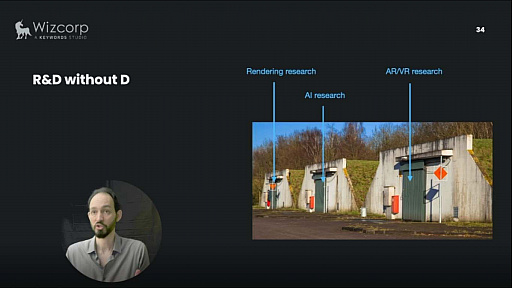 日本のゲーム業界がR&D(研究開発)にかける費用は他国とあまり変わらない。しかし,研究に携わる人は開発側の仕事にあまり興味を持たず,せっかく研究した成果をゲームに応用していくという統合フェーズが存在しない。結果として「デモはカッコイイが,ゲームに活かされることがない」状況が生まれる。