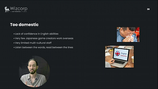 講演を行うハンサリ・ギオーム氏は,東京に本拠を置くゲーム開発スタジオWizcorpのCEOを務めている。2006年に日本に住み始めて以来,ゲーム開発者としてのキャリアのほとんどを日本で積み上げてきたハンサリ氏は,フランスと日本ゲーム界の違いに疑問を覚えたことから独自の調査を開始した。具体的には「業界に10年以上勤めていて,海外ゲーム業界での仕事経験のある大手デベロッパやパブリッシャの幹部級人物」達を対象に聞き取り調査を行ったというもので,その結果を元に考察したのが今回の講演となる。