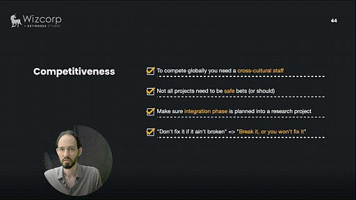 さまざまな文化のスタッフを受け入れ,リスクと安全のバランスを取ったポートフォリオを作る。研究プロジェクト内に,ゲームに統合する段階を取り入れる。そして,物事の改善を恐れない。