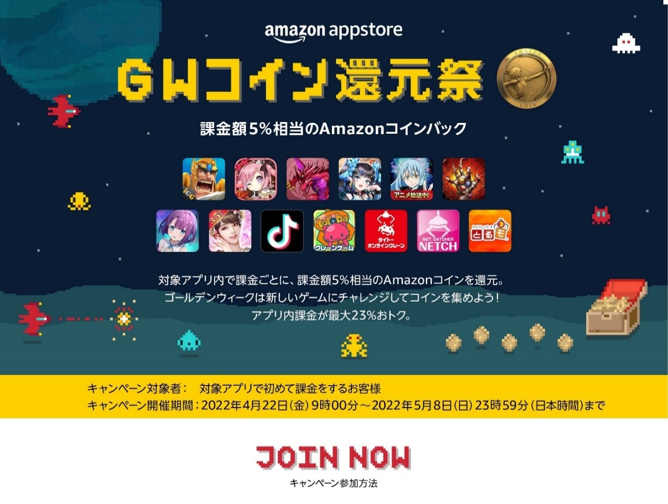 「Amazon アプリストア GW コイン還元祭」が開催に。対象ゲームの課金額の5%がコインバックされる