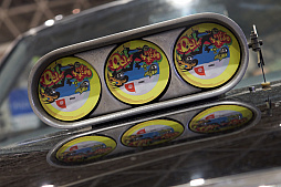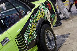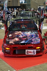 「ジェットセットラジオ」の痛車。後部には,キャラクター“ガム”の姿も。車内にはドリームキャストがあり,同じく車内にあるディスプレイに映像を出力していた。