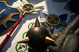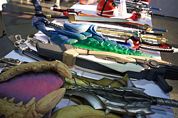 コスプレイヤーの自作コスプレアイテムが展示されていた「自作コスプレアイテム体験コーナー」。ゲームやアニメに登場する装備も数多く用意されており,自由に触ることもできた。