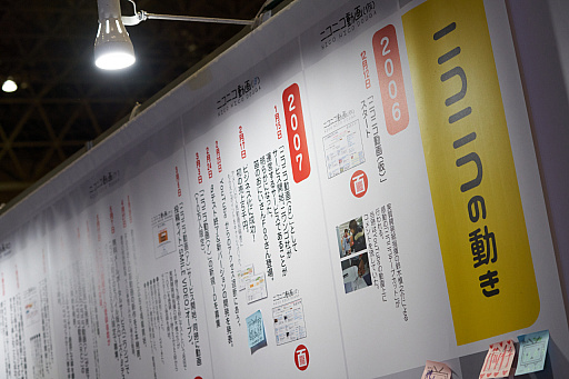 2006年に始まった「ニコニコ動画(仮)」の現在までの年表が,やたらと詳細な内容で掲示されていた。かなり細かい出来事も書かれていたので,貴重な資料にもなりそうだ。