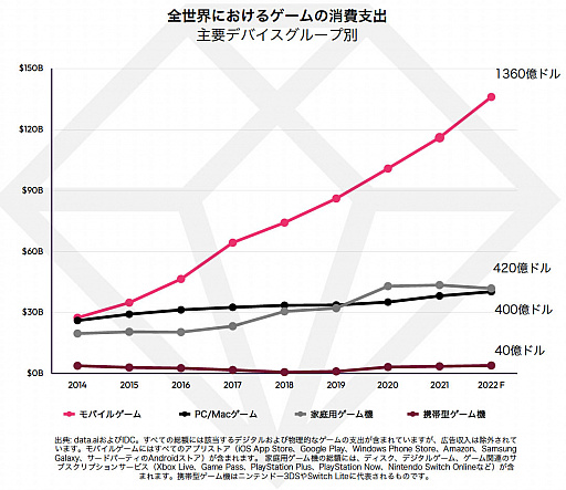 現段階で,2022年のゲーム市場における消費支出は2220億ドル(約28兆2151億円)に達し,前年に比べて大幅な伸びが見込まれている。原動力となったのはモバイルゲームの急成長だ。シェア全体の61%を占め,1360億ドル(約17兆2849億円)を超える見込みであるという。この数字は,2番目の規模を持つコンシューマ機市場の3.2倍で,成長率は,ゲーム市場全体の1.7倍になるとのことだ。