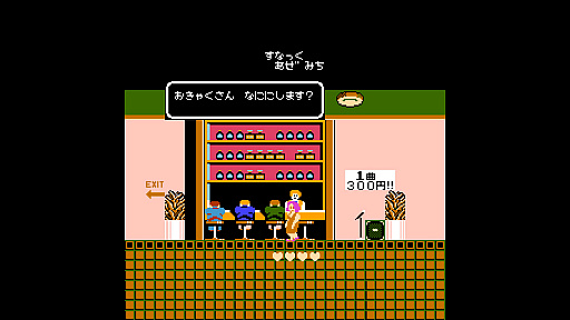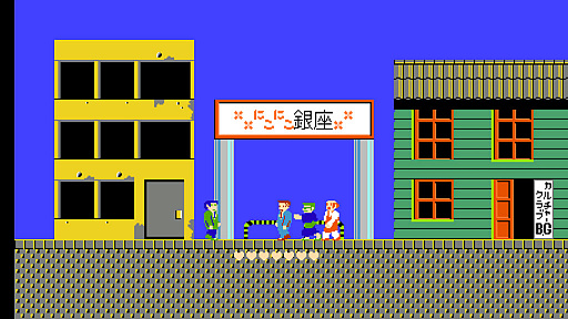 「たけしの挑戦状」のゲームシステムは,さまざまな店が軒を並べる街を,主人公が自由に歩き回って住民と会話し,ときには襲いかかってくるヤクザをアクションで倒すといったものだった。