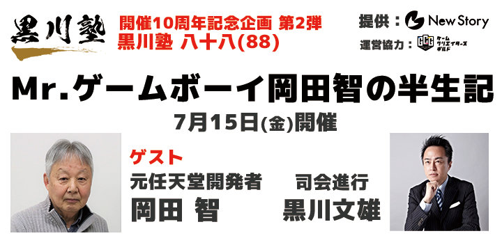 第88回「黒川塾」,7月15日19:30より開催。ゲストはゲームボーイシリーズの開発に心血を注いだ元任天堂・岡田 智氏