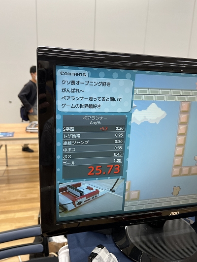 ゲーム画面は,ここ最近で流行っている“RTA(リアルタイムアタック)イベントの配信”を思わせる作りに。カセットを叩く手元を映すカメラや,視聴者(架空だが)のコメント欄まで備えており,その芸の細かさにまず笑いが出る。