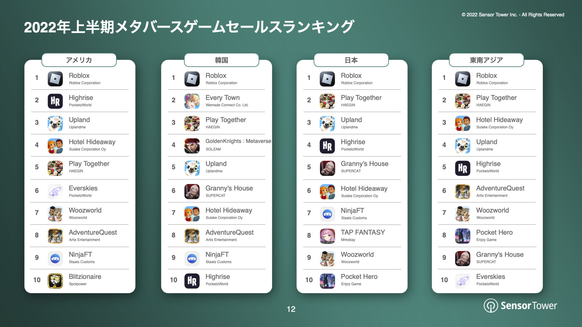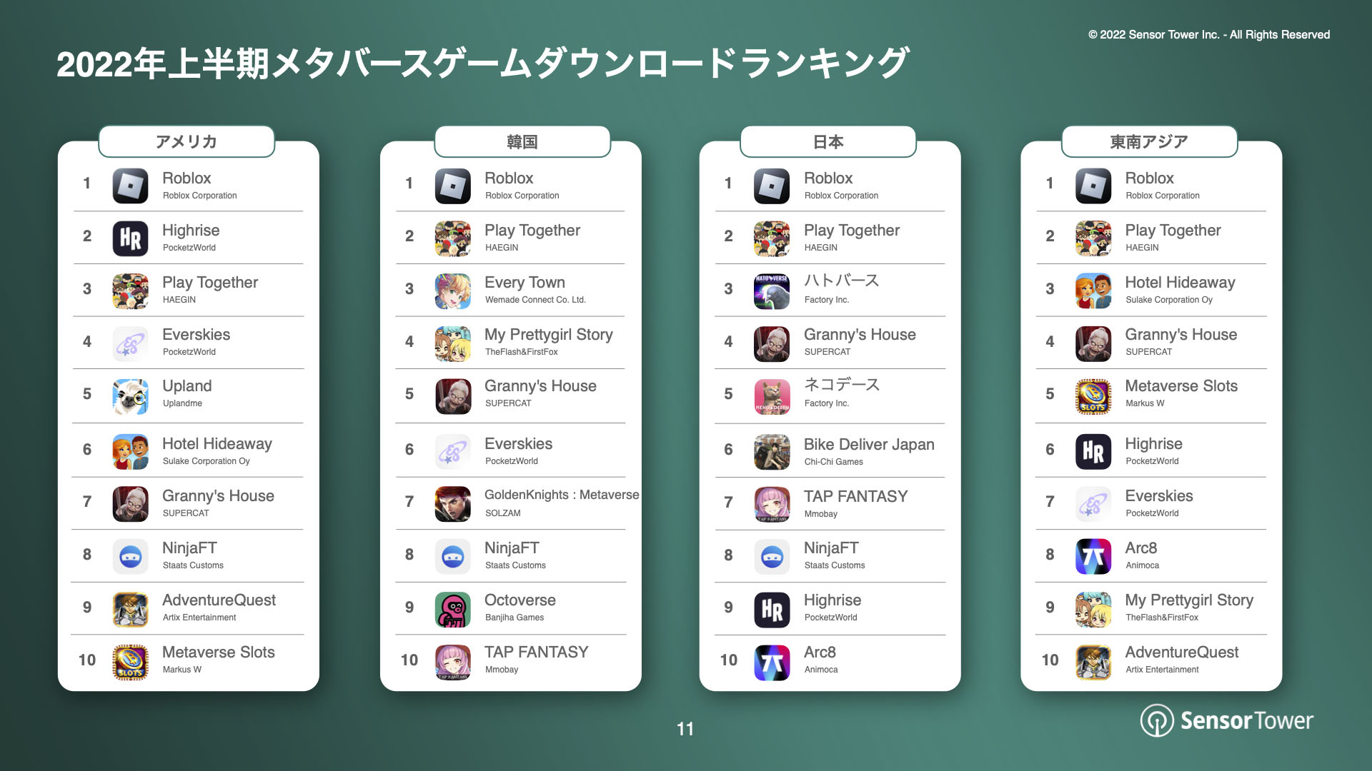 メタバースモバイルゲーム市場の変化についての分析結果をSensor Tower発表