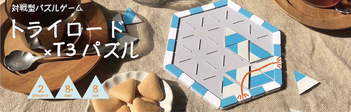 「トライロード×T3パズル」がゲームマーケット2022秋で販売。2色に分かれた三角形を交互に置いて道を作ったほうが勝ち
