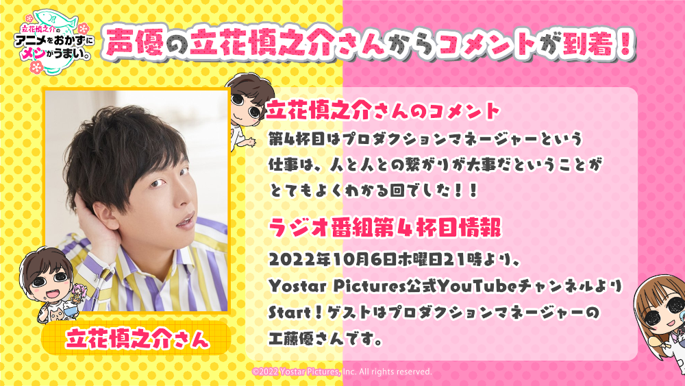 Yostar Picturesの情報発信番組「立花慎之介のアニメをおかずにメシがうまい。」第4杯めを本日21:00より配信