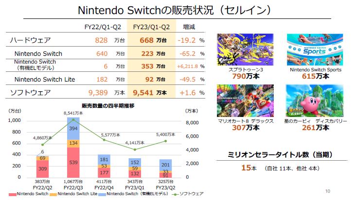 任天堂,2023年3月期 第2四半期の決算短信を公開。ソフトウェアが好調で増収増益。スプラトゥーン3やNintendo Switch Sportsなどが牽引