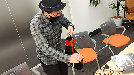 ![]() サウンドバーガーとOVOを接続するCOSIO氏 |