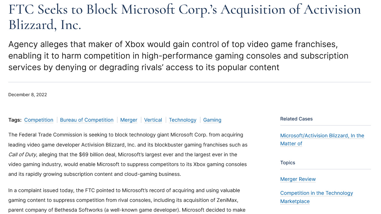 米国の規制当局がMicrosoftによるActivision Blizzard買収を阻止するため訴訟を起こす