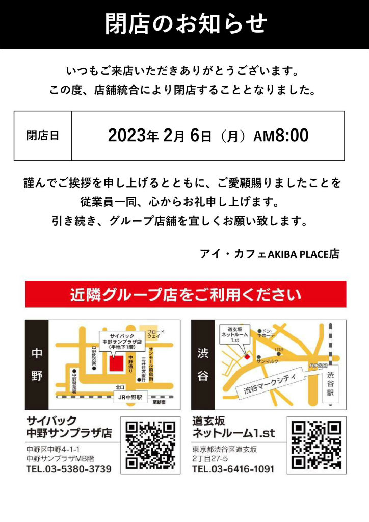 FPS界を支えた「アイ・カフェ AKIBAPLACE店」,2023年2月6日に閉店