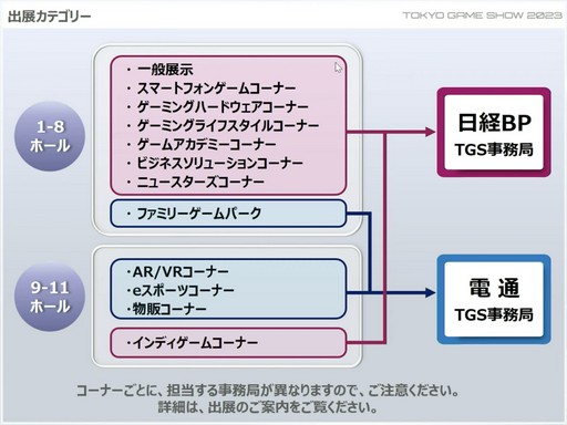 TGS2023の出展カテゴリーも示された。コーナーごとに,日経BPと電通それぞれの事務局に分かれている