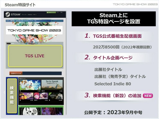 前回に引き続き,Steam内にTGS2023と連動する特設サイトが設けられる。今回は検索機能が追加される