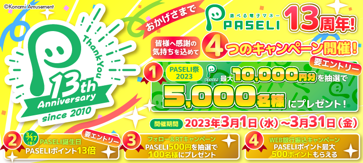 電子マネー「PASELI」,13周年を記念して4つのキャンペーンを開催