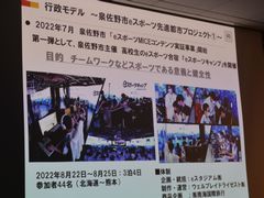 南海電鉄がeスポーツ事業に参入した経緯がひと通り語られると,講演の話題はここ数年の間に大阪周辺で行われた,eスポーツに関連する施策が紹介された。