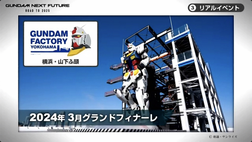 リアルイベントでは,まず動くガンダムが展示されているGUNDAM FACTORY YOKOHAMAの開催が,2024年3月まで再延長されたことが紹介に。