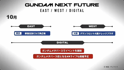 さらにガンダムメタバースプロジェクトおよび映像展開を盛りあげるべく,2022年に引き続き総合イベント「GUNDUM NEXT FUTURE 2023 EAST/WEST/DIGITAL」を,2023年10月に開催する。リアル会場は東京・新宿住友ビル 三角広場と,大阪・グランフロント大阪 ナレッジプラザだ。またデジタル会場はガンダムメタバース空間内となり,XRライブも実施する予定だ。開催日やイベント詳細は,後日公開される。