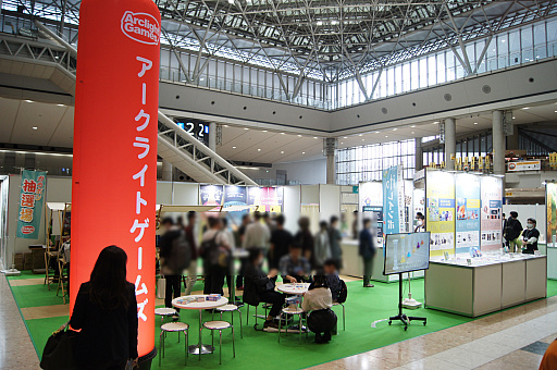 「ゲームマーケット」を主催しているアークライトは,アトリウムスペースに出展。新作タイトルの試遊台や,豪華なコンポーネント(内容物)を持つ作品の展示,手にとって遊べるアトラクションなど,大きなスペースを活用したブースになっていた。