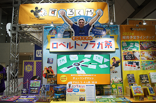 毎回遊び心あふれる展示が用意されるすごろくやのブースでは,ゲームデザイナーであるロベルト・フラガ氏をフィーチャーした“すごろくやのロベルト・フラガ祭”が実施されていた。