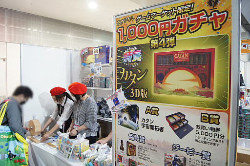 最近のゲームマーケットにおけるジーピーブースでは,恒例になりつつある“ゲームマーケット限定1000円ガチャ”も登場。特賞の「3Dカタン」はもちろん,A賞以下にも1000円以上の商品が多数含まれているということで,今年も長い列ができていた。
