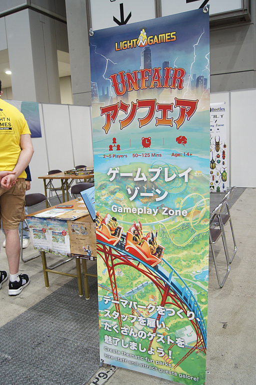 今回が初出展となるLight N Gamesは,韓国に拠点を置くボードゲーム出版社だ。ブースには,テーマパークの運営を題材にした「Unfair(アンフェア)」,昆虫の収集と展示を行う「Pins & Beetles」,ファンタジー世界の冒険を描く「KINGSWOOD」の3作品が展示されていた。