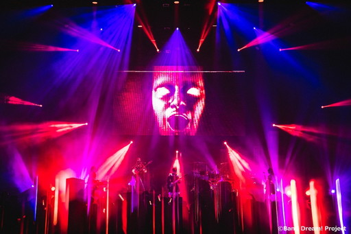 ライブ開始直後,会場内の照明が落ちるとともに,古い映写機風の不気味な映像がステージ上へ投影される。ゴシックな装飾品や,拡大された人間の眼球内にAve Mujicaのロゴが映った画面など,これまでの謎に満ちたコンテンツを想起させる映像が次々に映し出されていた。