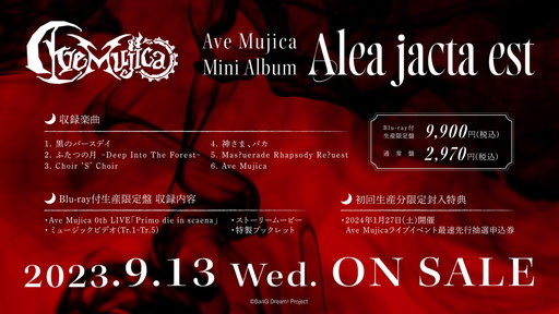 公演後には,2023年9月13日にリリース予定のミニアルバムや,2024年1月27日の横須賀芸術劇場におけるAve Mujica 1st LIVEの情報も発表された。また直近のライブ情報として,2023年9月17日に実施されるRoselia単独ライブのオープニングアクト出演も明かされた。