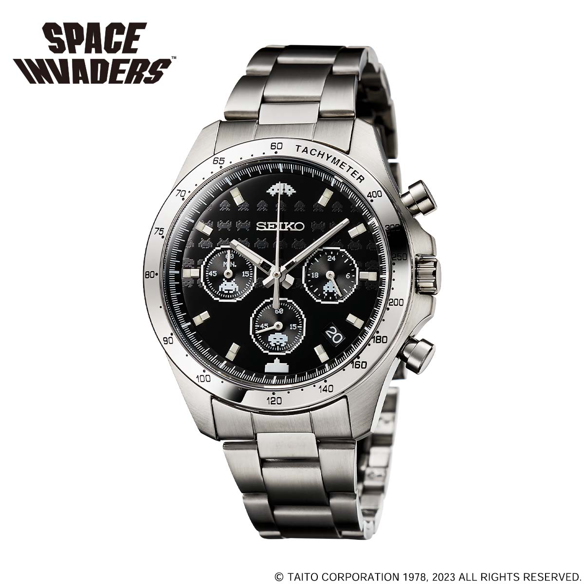 「スペースインベーダー」の誕生45周年を記念したセイコー ウオッチが1978個限定で販売開始。ゲームの世界観を詰め込んだクロノグラフモデル