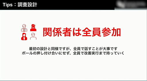 まず行うのは,何を知りたいか,どのようなグループに聞くかを決める「調査全体設計」だが,ここにはプロデューサーはもちろん,デザイナーやマーケティング担当者など,「関係者全員」が参加して,それぞれの目線でディスカッションを重ねるべきとした。