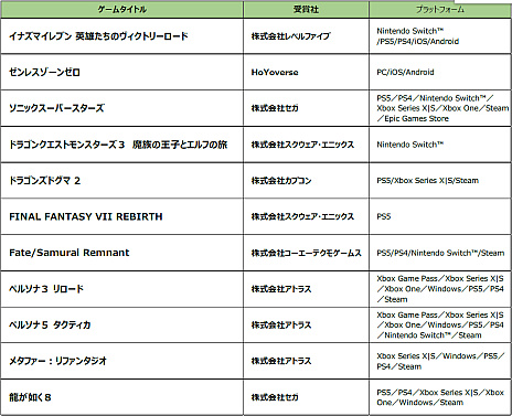 受賞したのは,HoYoverseの「ゼンレスゾーンゼロ」(PC / iOS)や,コーエーテクモゲームスの「Fate/Samurai Remnant」(PC / PS5 / Switch / PS4)など11作品。セガ&アトラスからは,「龍が如く8」(PC / PS5 / Xbox Series X|S / PS4 / Xbox One)や「ペルソナ3 リロード」(PC / PS5 / PS4 / Xbox Series X|S / Xbox One),「メタファー:リファンタジオ」(PC / PS5 / Xbox Series X|S / PS4)を含む5作品が受賞していた。