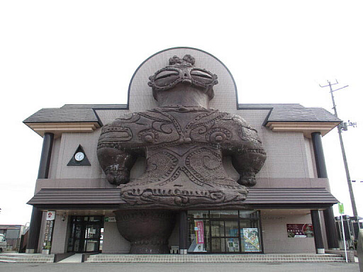 また木造り駅は,駅舎の外壁に取りつけられた,高さ17mを超える巨大な遮光器土偶のオブジェで知られており,目の部分が赤く発光する。当初は列車の発着に合わせてこれを明滅させる「いらっしゃいビーム」を放っていたが,「子供がおびえる」などの理由で自粛したことが報じられていた。2020年には駅舎のバリアフリー化に合わせてリニューアルが実施され,赤だけでなくオレンジや紫など7色に光るようにパワーアップされたという。