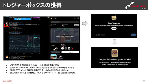ペットの育成としてやることは,BPETトークンを使ったレベリングとエサやりです。BPETやエサは,トレジャーボックスから獲得することができます。xPetをブラウザ拡張機能としてインストールすると,Xの画面が変化して,ポストの中にトレジャーボックスが登場するようになります。