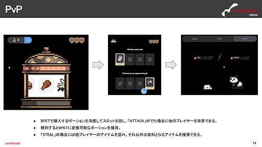 BPETで購入したポーションを使ってスロットを回し,出た目によってほかのプレイヤーのアイテムを奪ったり,バトルを通じてポーションを獲得することができます。