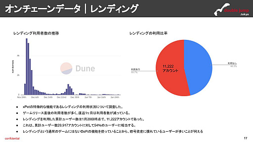 レンディングの利用状況を見ると,累計ユーザー数の半数以上がこの機能を利用しています。これは,プレイヤーがゲーム内の金融要素に対して比較的開かれていることを示していますが,一方でリスク管理の重要性も同時に強調しています。