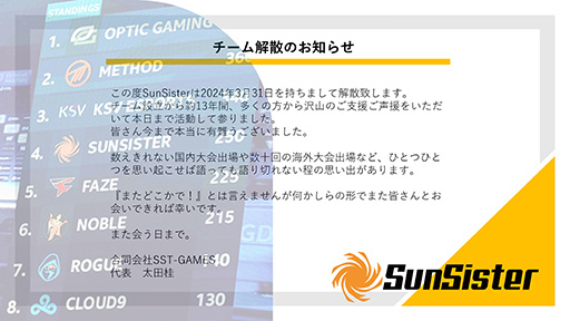プロゲーミングチームSunSister,2024年3月31日をもって解散。PUBG,Apex Legendsなどの部門で活躍した13年に幕