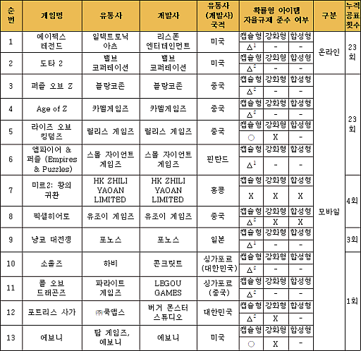 法の施行によりゲームサービス事業者は,確率型アイテムを取り扱うゲームがある場合,必ずユーザーが分かりやすいようにゲーム内またはホームページに具体的な情報を表示しなければならず,広告にも確率型アイテムが含まれているという文言を挿入しなければならない。「確率型アイテム」の対象は,有料で購入するアイテムのうち,具体的な種類と効果,性能などが偶然の要素で決定されるものすべてである。