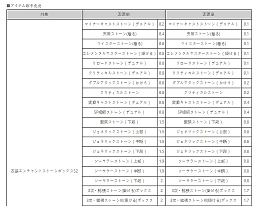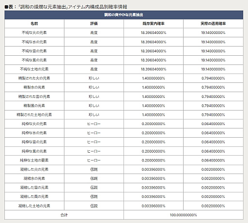 しかしデータ抽出過程の設定ミスにより,加工システムで獲得できないアイテム31種が含まれ,それらが「お知らせ」に登録されていたことが4月9日に確認され,修正された(その結果,実際のアイテム獲得確率は上昇することになった)。