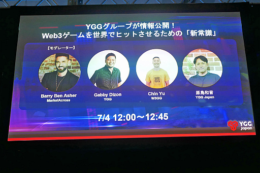 登壇したのは,W3GGの共同創設者兼CFOのChin Yu氏,YGG Japanの原島和音氏,YGGの共同創設者であるGabby Dizon氏で,Market AcrossのBarry Ben Asher氏がモデレーターを務め,ブロックチェーン技術がゲーム業界にもたらす革命的な変化について,楽観的な見方から始まった。