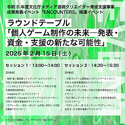 初日の2月15日に実施されるラウンドテーブル「個人ゲーム制作の未来 ― 発表・資金・支援の新たな可能性」は,セッション1(13:00〜14:00)「インディゲーム制作の課題とケーススタディ」とセッション2(14:30〜15:30)「アートが向き合うゲーム制作へのチャレンジ」という2つのテーマのセッションが行われる。