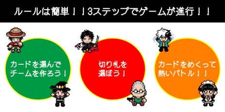 2.場に出たカードの能力を発動させた後、パワーを比べよう。そしてパワーがより大きいカードが勝利するぞ!勝ったカードは場に残り、負けたカードは捨札になる。カードのパワーが同じ場合は両方とも捨札になるぞ!