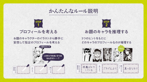 主人公との関係性などの設定を妄想し,それをヒントに親プレイヤーがお題のキャラクターを探す,3〜6人用のパーティーゲームだ。
