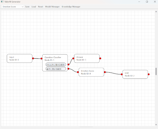 ノーコード開発ツールのような直感的な UI でノードを接続し、AI の挙動を制御できます。各ノードは通常のチャット AI に加え、感情分析・質問分類・RAG(Retrieval-Augmented Generation)などの機能を備えており、柔軟かつ高度な AI 制御を実現します。