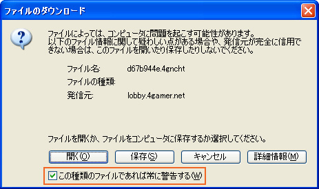 ルームリンクをクリックすると,Internet Explorerの場合,以下のようなファイル確認のダイアログが表示されます。