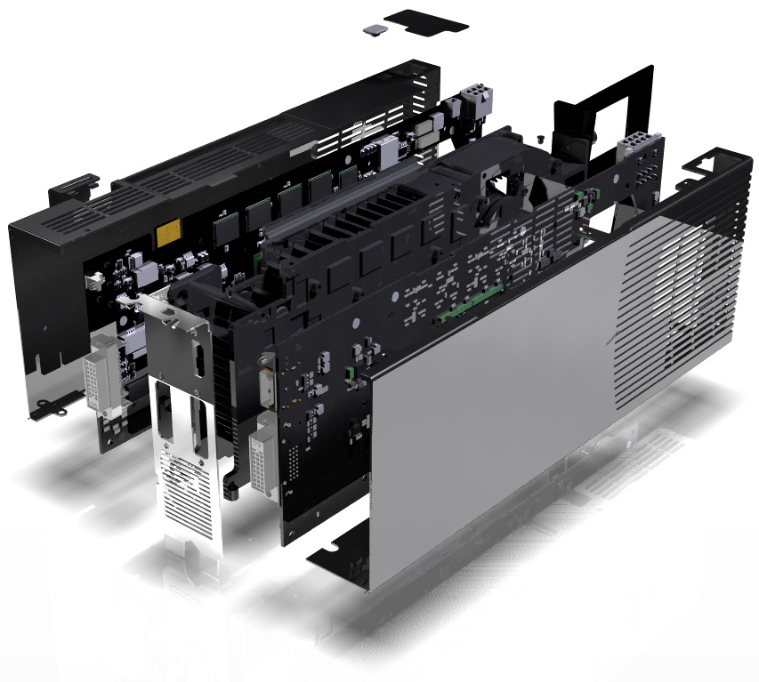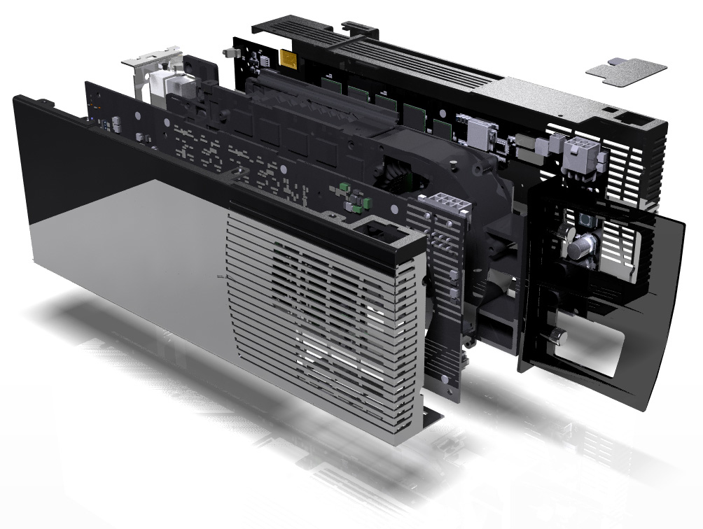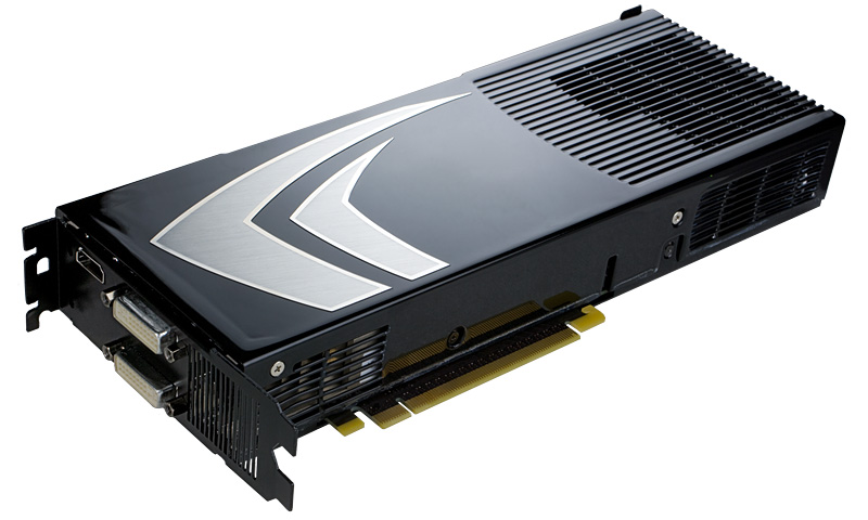 カードは2スロット仕様で,接続インタフェースはPCI Express 2.0。カード長は267mm(※突起部除く)で,全体が箱のような構造ですっぽりと覆われ,基本的にはPCI Expressインタフェースしか基板は見えない。NVIDIAが公開するイメージ図によれば,2枚のカードが冷却ユニットを挟み込むような構造になっているようだ。